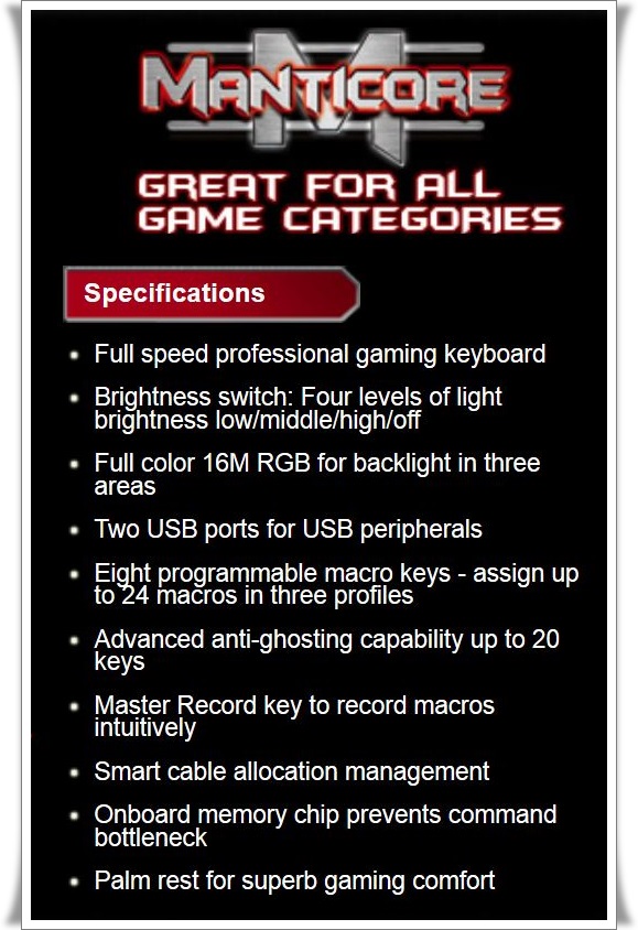 Fitur programmable backlit hingga 16 ribu warna pada 3 area berbeda plus total 24 macro sebagai sales poin utama keyboard ini agaknya belum bisa menjadi alasan kuat Genius membanderol GX-Gaming Manticore di harga USD$ 79. Khususnya di Indonesia, nama Genius belum terlalu sering terdengar di forum maupun komunitas gaming. Lebih tepatnya, genius masih harus berjibaku dengan produsen keyboard gaming berbasis rubber dome lain seperti Power Logic lewat produknya Armaggedon KAI 13. Walaupun jika kembali ke posisi harga plus fitur (di luar design), GX-Gaming Manticore cukup menang telak di banding beberapa keyboard gaming berbasis rubber dome dari merk Corsair ataupun SteelSeries.