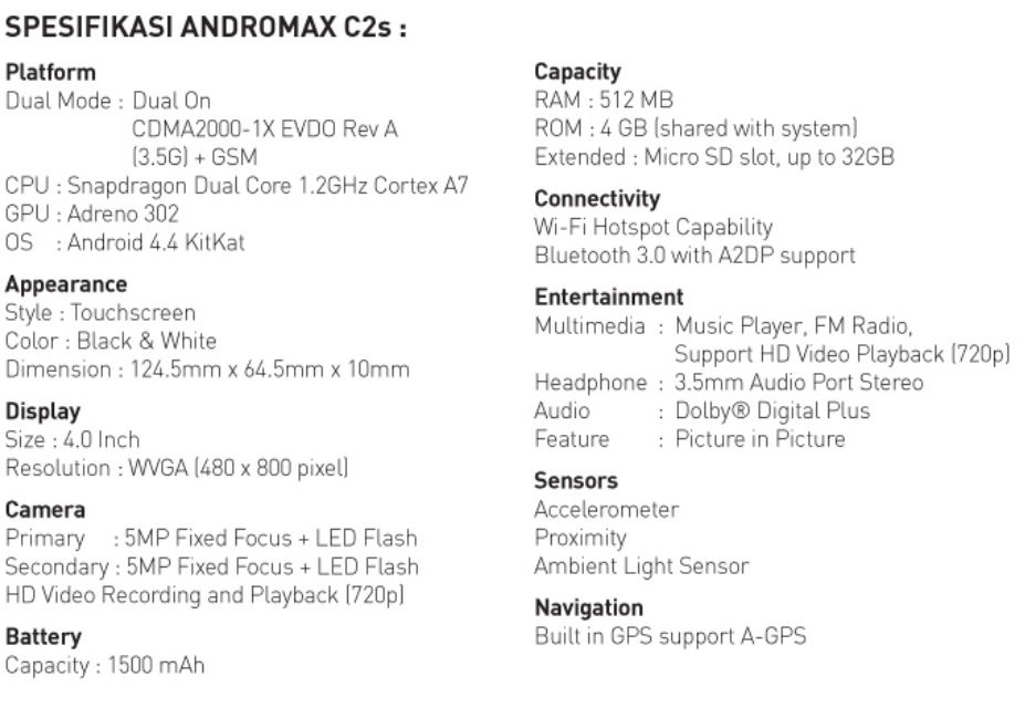 Spesifikasi Andromax C2sAndromax C2s tersedia dalam pilihan warna hitam dan putih dengan harga Rp 849.000,- bersama kartu perdana Smartfren dengan gratis paket data 600 MB untuk 7 hari. Dan tentu saja kamu bisa menikmati paket smartplan terbaru yang diluncurkan pada hari yang sama dengan Andromax C2S ini.