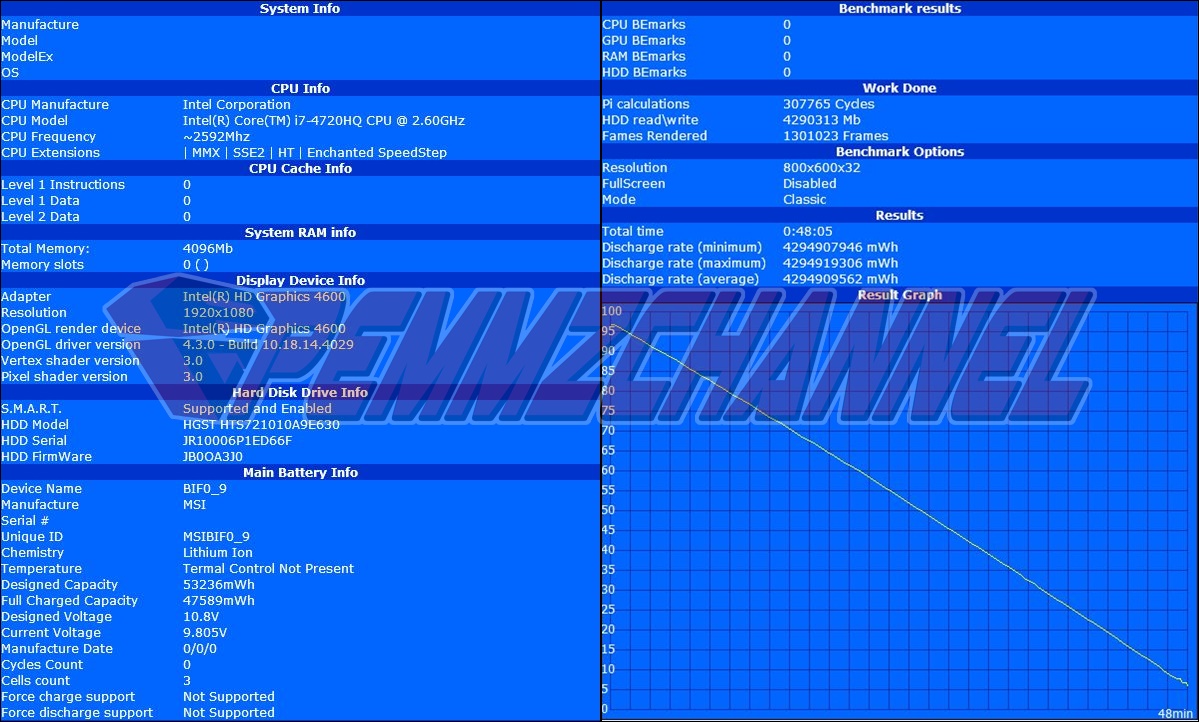 Dengan barebone yang menipis, MSI tetap memberikan kapasitas battery yang sama dengan seri sebelumnya, yakni 6 cell 48Wh. Dengan Test bad pengujian mode classic, didapat hasil 48 menit yang terbilang tidak wajar mengingat kinerja komponen khussnya GPU yang semakin efisien. Walaupun untuk sebuah gaming notebook sebesar ini, dengan panel 17-inch yang paling dominan menyedot layar, semestinya battery pada MSI GE72 bisa memberikan durasi lebih dari 60 menit.
