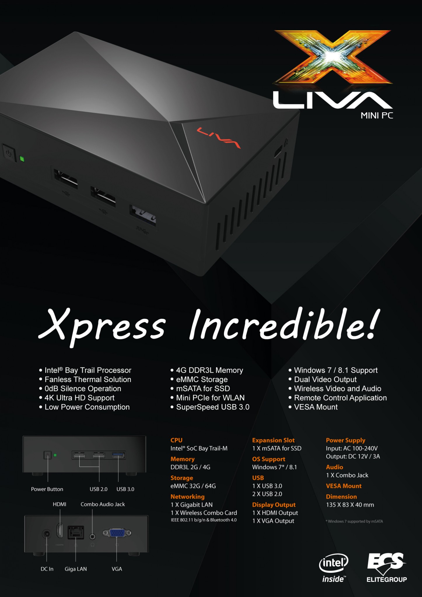 ECS Liva X tersedia dalam dua rasa, RAM 2GB + 32GB storage & RAM 4GB + 64GB Storage. Tentu, anda masih bisa menambahkan storage karena ia dibekali m-SATA slot yang bisa menampung m-SATA SSD hingga 512MB (saat ini).