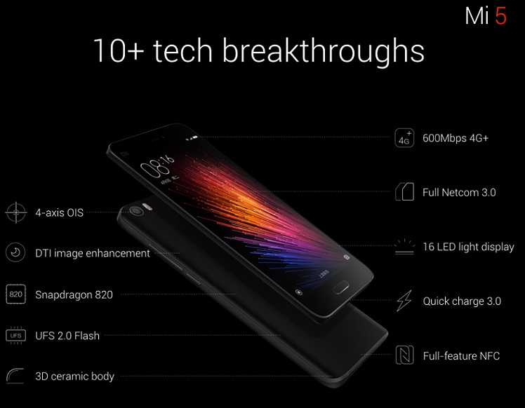 Spesifikasi Mi5 mengusung layar 5.15 inci full HD dengan bezel yang sangat tipis. Seperti rumor yang beredar, smartphone dengan Android Marshmallow ini dilengkapi fitur ala flagship, yaitu sensor fingerprint. Urusan dapur pacu, Mi5 ditenagai oleh prosesor Snapdragon 820 dan RAM berkapasitas 3 GB. Flagship dengan fitur NFC dan USB-C port ini di topang oleh baterai berkapasitas 3,000 mAh.