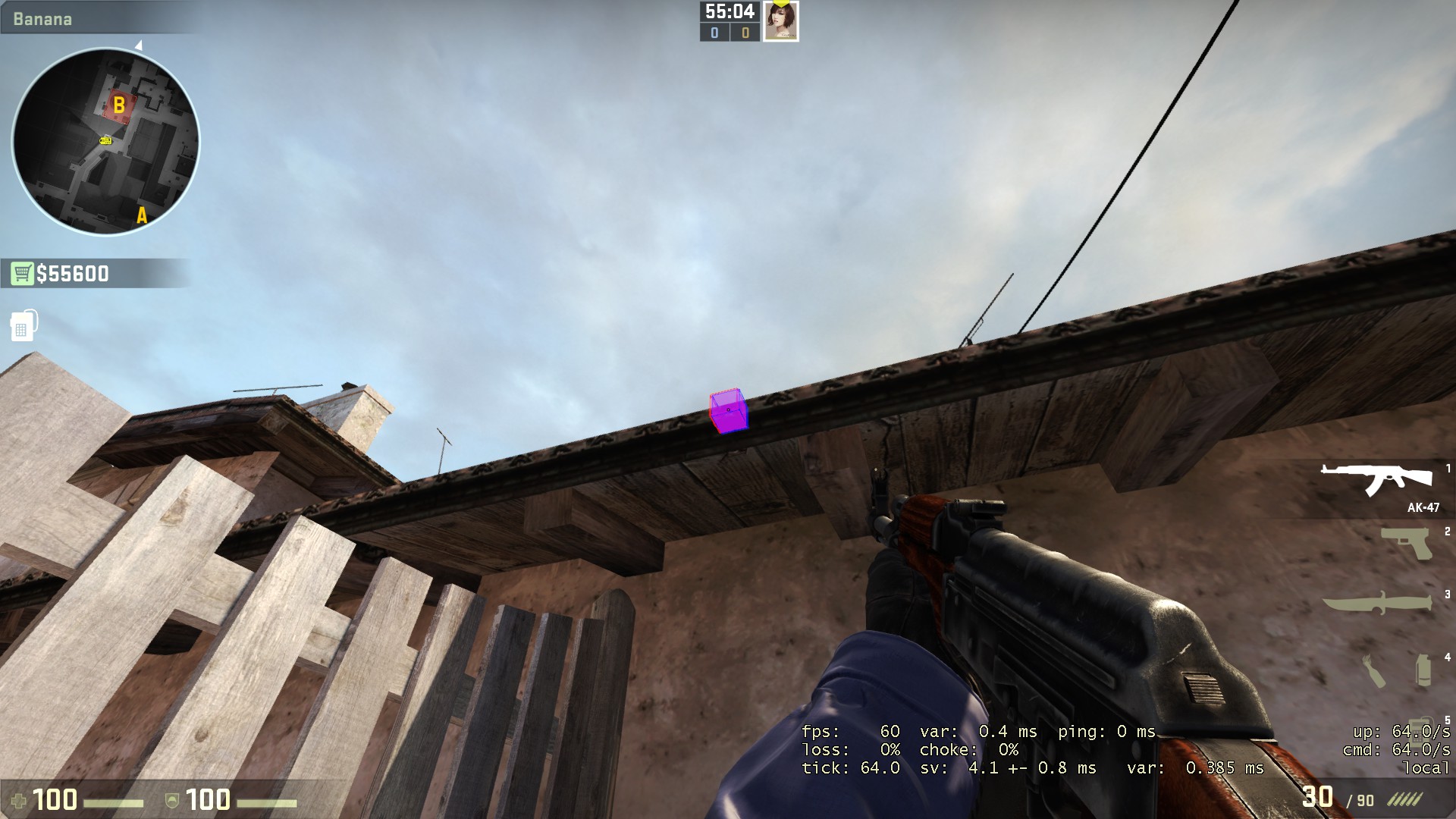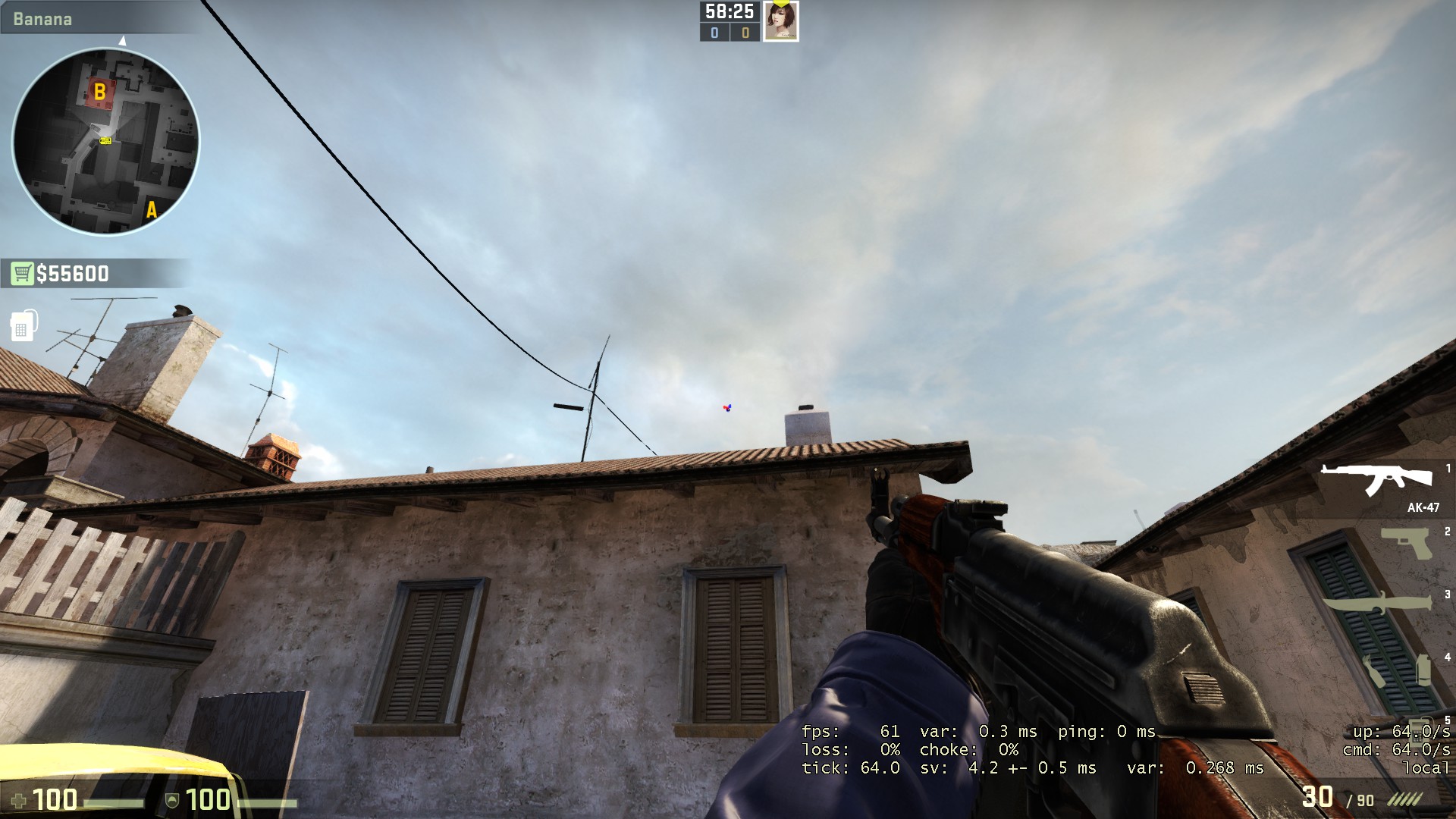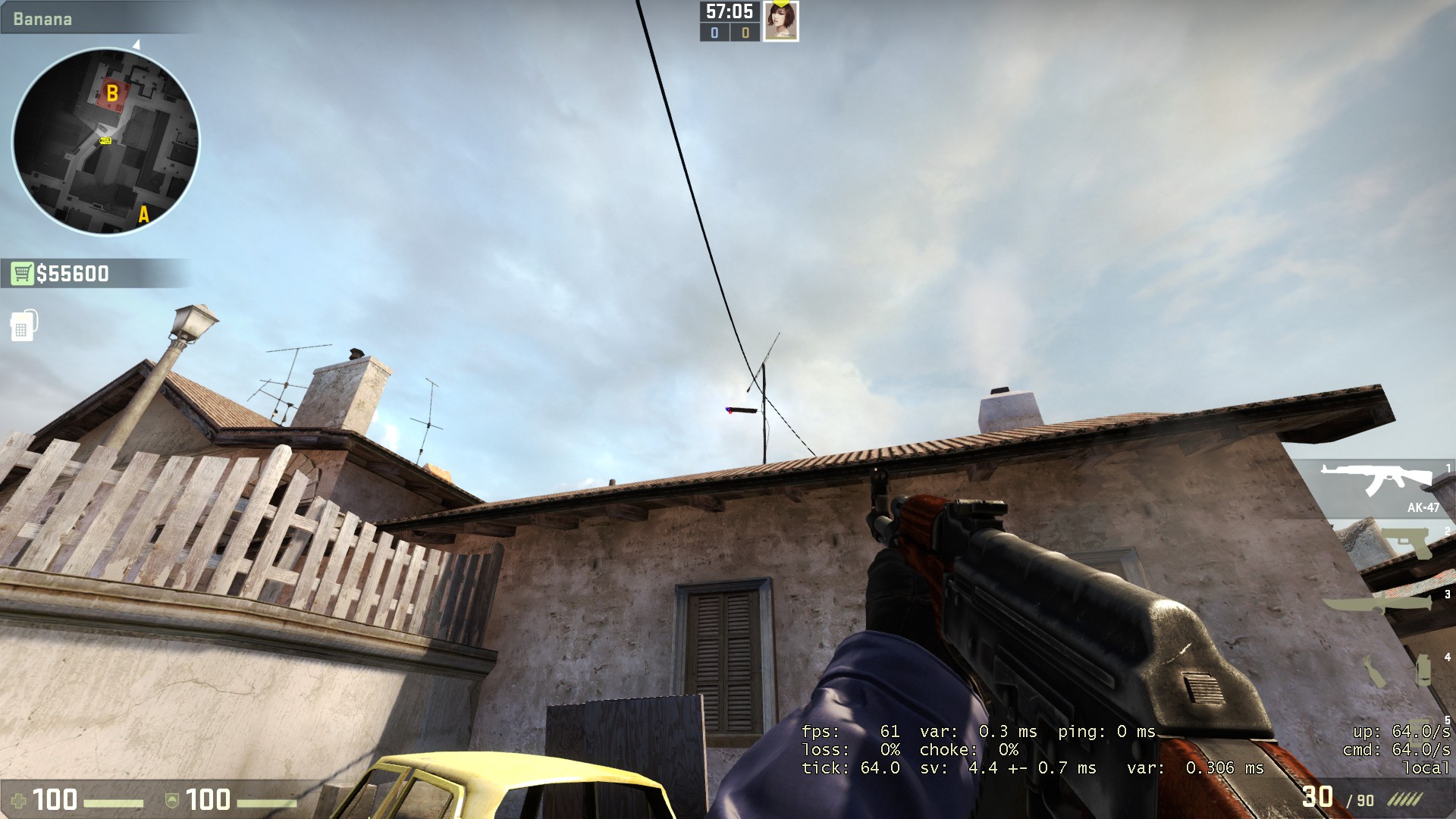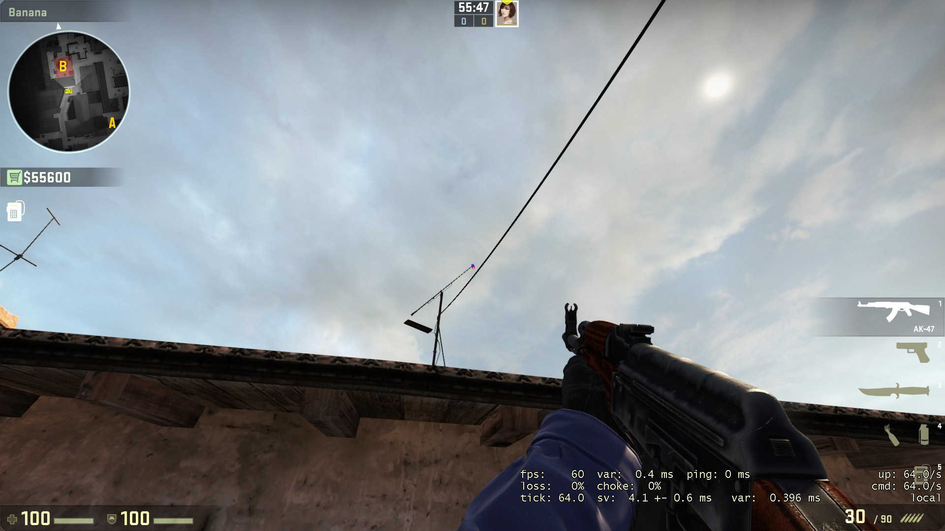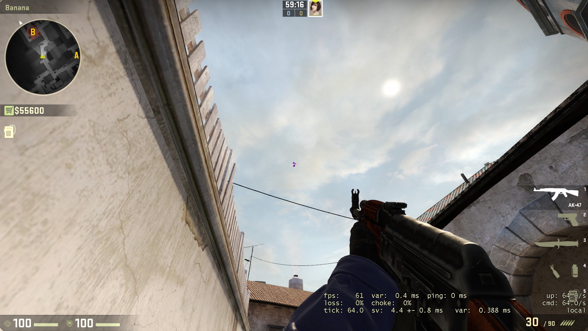 Berdiri lah di bagian depan dari tumpukan kayu di banana, lalu berbalik arah 180 derajat dan menghadap ke langit di atas kabel, posisikan crosshair sejajar dengan pagar kayu menonjol di kiri dan cerobong asap, lalu lemparlah seperti biasa
