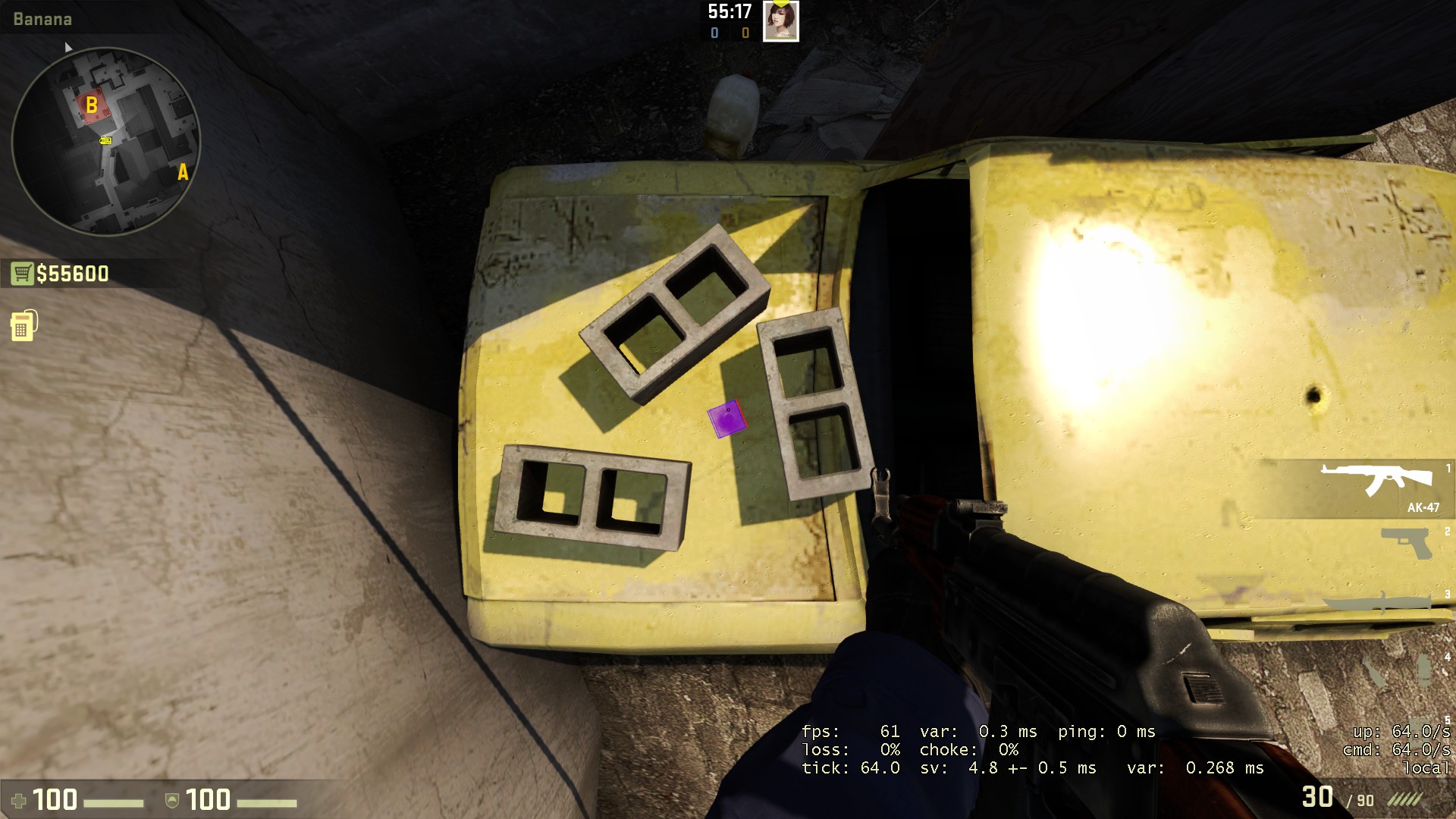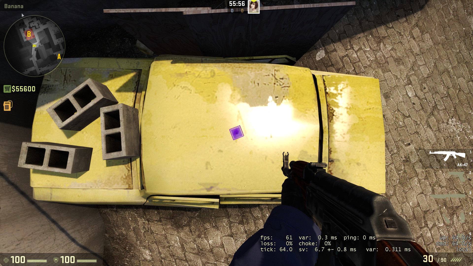 Naiklah ke atas mobil di banana, lalu hadaplah kebawah hingga crosshair udah di posisi bawah maksimal, dan aturlah posisi hingga atap mobil pas berada di tengah layar kamu