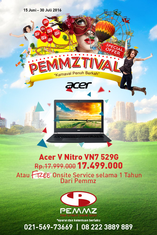 Untuk Acer VNitro 592G para customer dapat memilih promo cashback sebesar Rp.500,000 atau Free Onsite Service selama 1 Tahun dari Pemmz.
