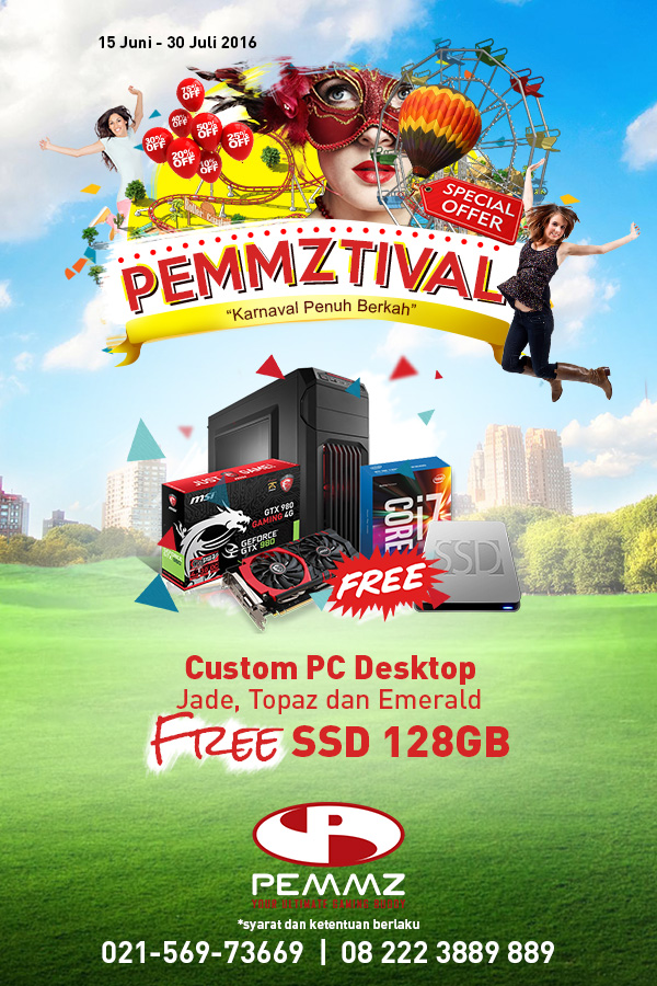 Desktop juga tidak ketinggalan pada program Pemmztival 2016. Setiap pembelian Desktop TOPAZ, JADE, dan EMERALD akan mendapatkan Free SSD sebesar 128GB untuk performa tanpa kompromi.