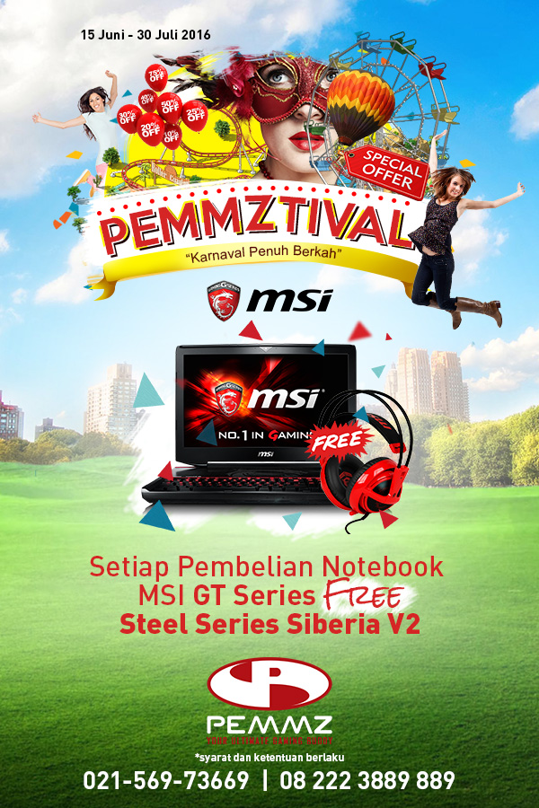 Untuk Gaming Laptop berbagai merk, terdapat banyak diskon yang menarik pada Promo Laptop Ramadhan Pemmz tahun ini. Mulai dari Free Gaming Gear, Tebus accessories hanya dengan Rp.10,000, Bahkan hingga cashback. Untuk setiap pembelian MSI GT Series akan mendapatkan Free Steelseries Siberia V2 Gaming Headset. Untuk MSI GL dan PE series akan mendapatkan promo hanya dengan membayar Rp.10,000 dapat menebus Coolingpad CMC3 dari Cooler Master.