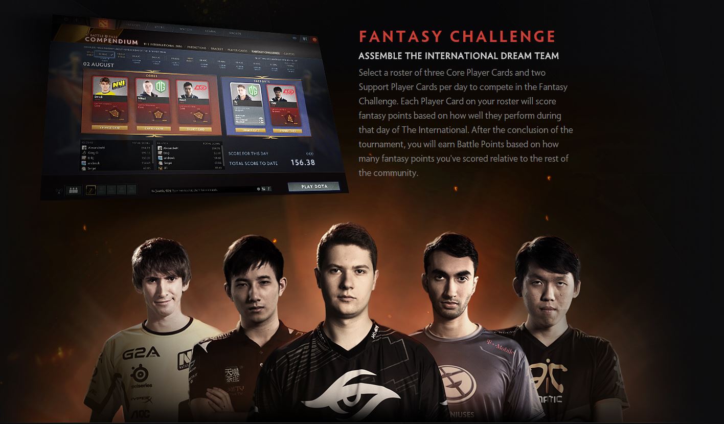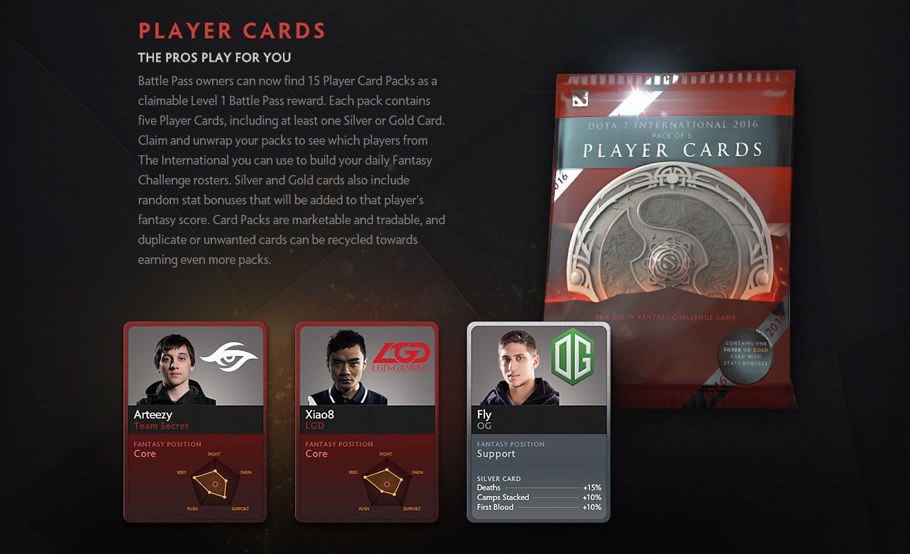 Dengan update terbaru The International 2016 Compendium. Para player yang telah mempunyai Battle Pass akan mendapatkan kumpulan kartu pemain untuk dikumpulkan ataupun disusun menjadi tim impian kamu. Terdapat tiga kelas kartu, bronze, silver, dan gold. Untuk silver dan gold kamu akan mendapatkan berbagai bonus battle point sesuai yang tertera didalam kartu. Setelah event selesai kamu akan dihadiahkan dengan battle point sesuai dengan performa tim impian kamu. Selain itu kamu bisa melihat seberapa baik tim impian teman kamu.