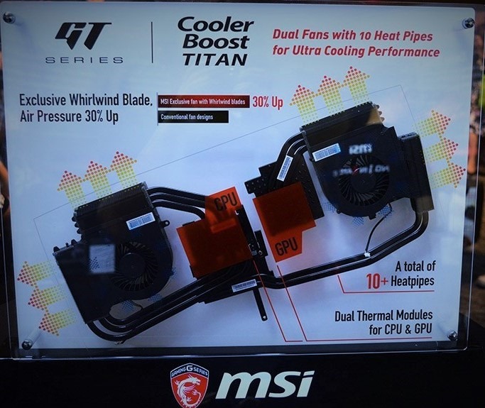 Seluruh line-up yang ditampilkan dalam acara launching, selain menawarkan keluarga chip grafis Nvidia Pascal, juga sudah lebih disempurnakan dari berbagai sisi pendukung, baik hardware maupun software (fitur). Paling menarik bagi pemmzchannel adalah Cooler Boost Titan (untuk GT series) dan Cooler Boost Trinity (untuk GS series). Ini solusi baru sistem pendingin yang pada seri GTX 10 ini di buat lebih advance. Terdapat hingga 3 buah whirlwind fan, yakni teknologi kipas dengan jumlah baling-baling hingga 41 buah, dan opsi hingga 18 heatpipe dalam sebuah sistem pendingin di salah satu laptop gaming MSI yang dijanjikan mampu memberi performa pendinginan se-efisien mungkin.