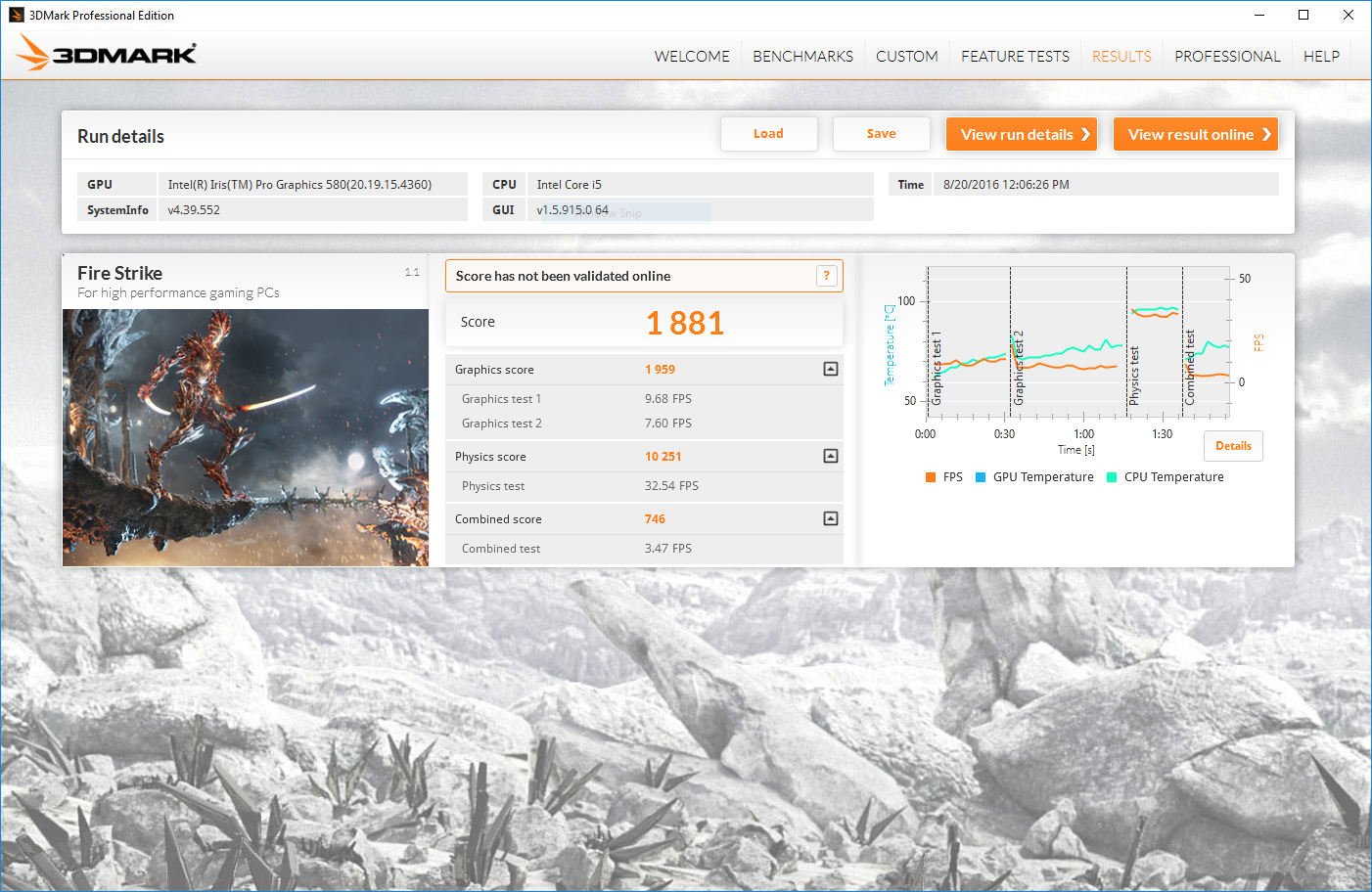 Berhubung pemmzchannel belum memiliki akses untuk unit Razer Core, maka testing akan dilakukan menggunakan Iris Pro Graphics. Dan berhubung hari ini kita akan melakukan preview sedikit, maka kita tidak akan membahas game secara lebih dalam. Dapat kita lihat sendiri untuk 3DMark Firestrike, Intel Skull Canyon NUC mampu mendapatkan skor 1881, cukup mengesankan mengingat Iris Pro merupakan prosesor grafis yang terintegrasi kedalam CPU.