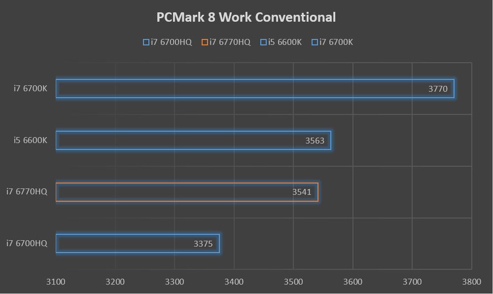Tidak hanya gaming saja, dalam benchmark produktifitas kita disini menggunakan PCMark 8 dengan dua skenario, work maupun creative. Pada work conventional, benchmark lebih mensimulasikan pekerjaan proses kata dan angka, selain itu browsing dan juga video chatting. Intel Skull Canyon NUC mampu mengungguli prosesor yang sekelasnya, notabene Core i7 6700HQ yang terdapat pada semua laptop highend, dan mampu mengejar CPU desktop pada keluarga Skylake.