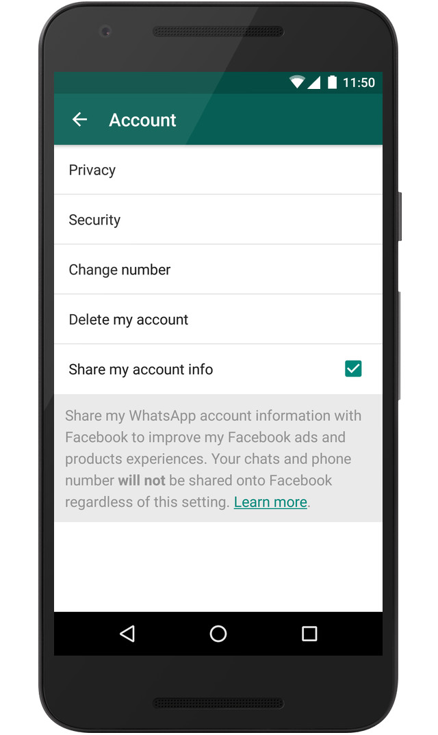 Jangan khawatir. Arahkan telunjuk ke menu Settings > Account > Share my account info, dan kemudian hilangkan tanda centang yang tersedia. Opsi ini hanya berlaku selama 30 hari setelah pengguna menyetujui Privacy Policy terbaru, jadi pastikan bahwa Anda cepat-cepat melakukannya sebelum opsi tersebut hilang. Anda tidak perlu melakukan apa-apa bila hanya memiliki akun WhatsApp.