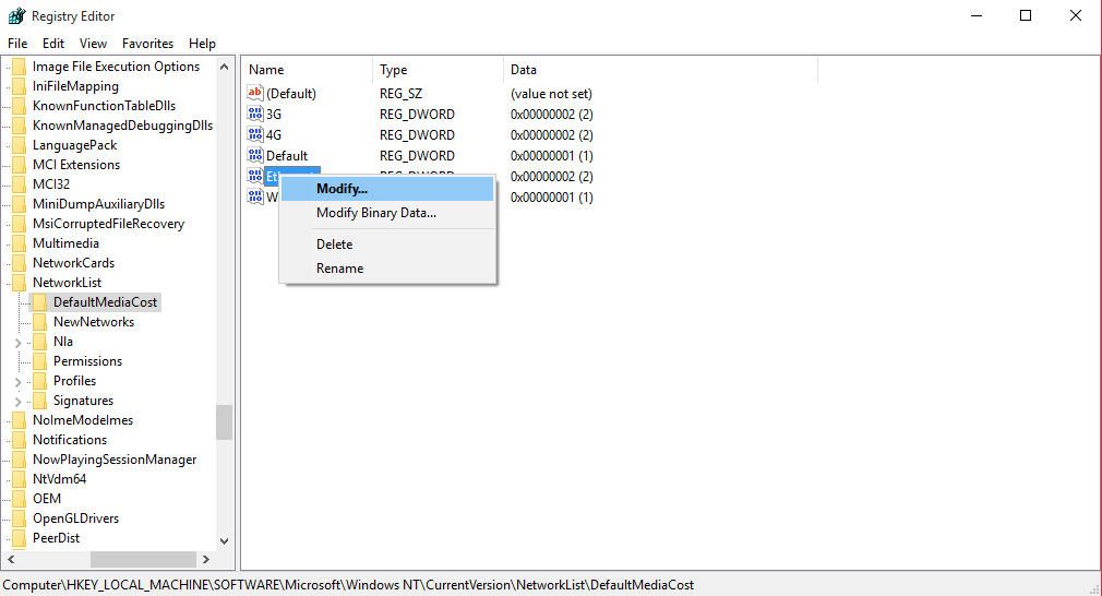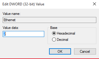 9. Klik kanan pada opsi Ethernet di jendela Regedit, dan kemudian klik Modify. Sebuah jendela Edit DWORD (32-bit) Value akan terbuka kemudian.