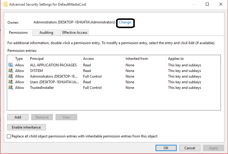 5. Kamu akan diarahkan ke Advanced Security Settings for DefaultMediaCost, klik pada bagian bertuliskan Change.
