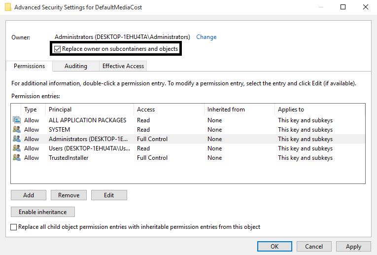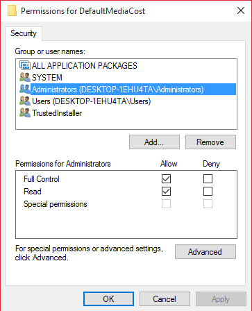 8. Kembali ke laman Permissions for DefaultMediaCost, kamu perlu melakukan klik pada Administrators pada grup dan kemudian berikan centang untuk Full Control Allow di bawah tulisan Permissions for Administrators. Kemudian klik OK.