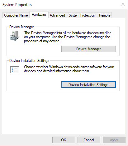 Gunakan kolom pencarian (search) dan ketikkan Advanced System Settings di dalamnya, untuk membuka jendela System Properties. Kemudian sortir pada bagian Hardware dan klik pada Device Installation Settings.