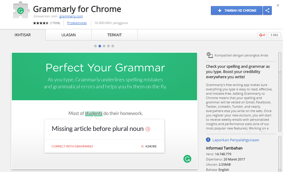 Di negara yang tidak berbahasa Inggris seperti di sini, Grammarly membantumu untuk memeriksa ejaan dan tata bahasa Inggris ketika mengetik email, mengisi formulir online, atau mengetik pesan di media sosial menggunakan bahasa Inggris. Grammarly membantumu untuk memperbaiki struktur kalimat, menggunakan pilihan kata yang pas, dan lain sebagainya.