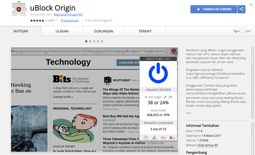 uBlock Origin eksHanya saja terkadang ekstensi yang satu ini akan memblok sesuatu yang tidak seharusnya diblok. Namun jangan khawatir. Ekstensi yang satu ini sangat mudah dioperasikan, dan sangat direkomendasikan dari segi keamanan.