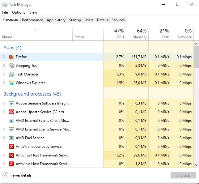 Ketika task manager muncul, utilitas ini secara alamiah menampilkan program yang sedang berjalan di dalam sistem. Detil setiap program tersedia di bagian kiri bawah pada utilitas tersebut. Kalau kamu tidak ingin menampilan semuanya, kamu bisa mengklik pada bagian “fewer details”. Ingat bahwa tampilan task manager ketika dibuka pertama kalinya bisa jadi berbeda-beda di setiap PC/laptop.