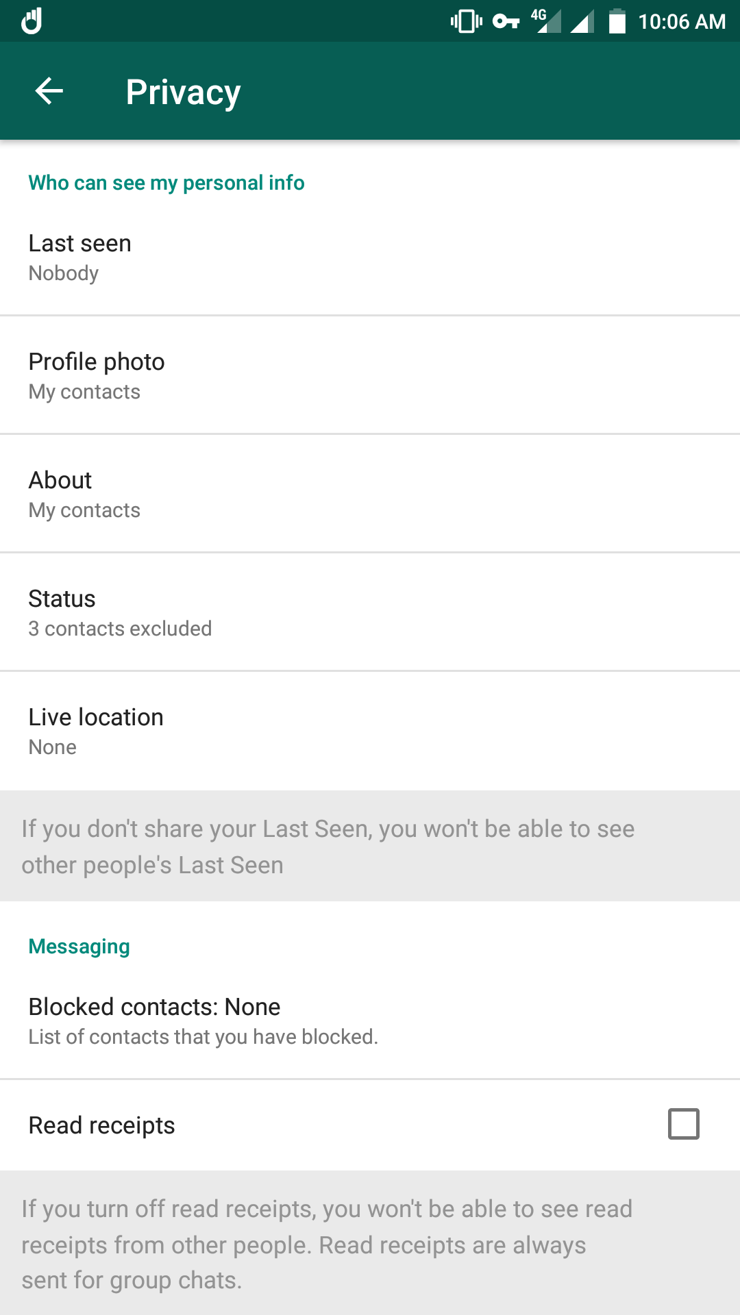 Bukalah Settings > Account > Privacy dan kemudian hilangkan tanda centang pada Read Receipts. Setelahnya, setiap kontak yang kamu ajak bertukar pesan tidak akan bisa melihat apakah kamu sudah membaca pesannya atau belum.