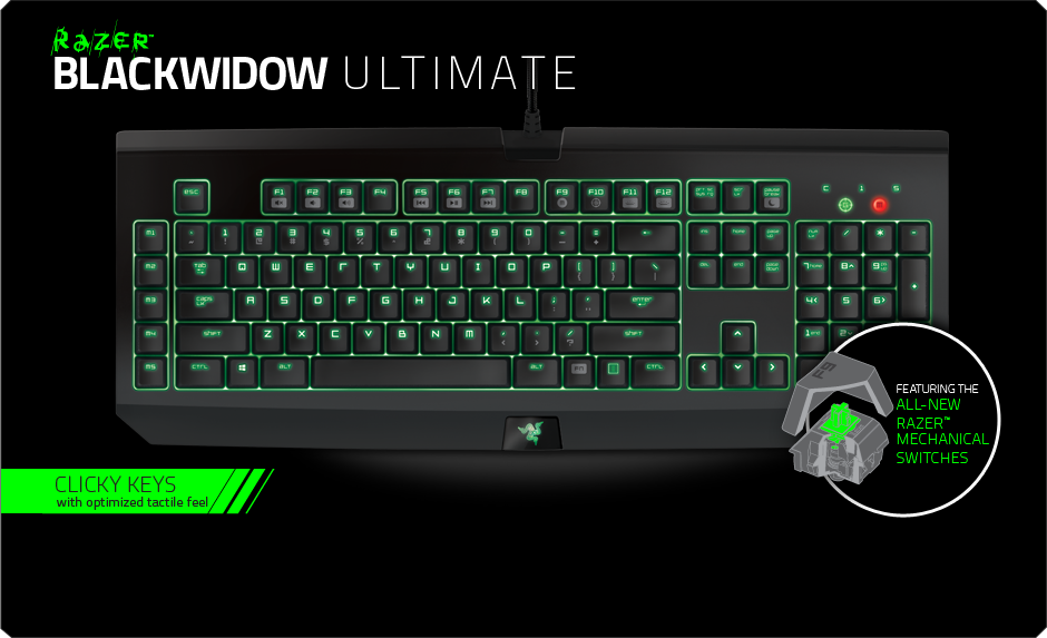 Keyboard mekanis BlackWidows Ultimate adalah sebuah perangkat keyboard yang hadir dengan fitur anti air dan debu, alias rating IP54. Daya tahannya mencapai 80 juta kali klik dan menghadirkan fitur Razer Green Mechanical Switch.