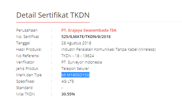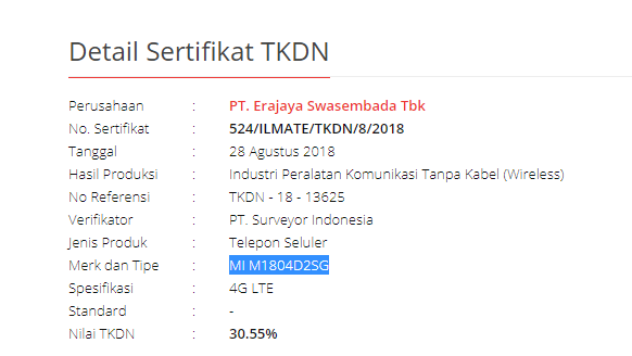 Sementara itu melalui website P3DN, ada sertifikat yang TKDN dengan kode MI M1805D1SG dan MI M1804D2SG. Sertifikat tersebut atas nama perusahaan PT. Erajaya Swasembada Tbk yang merupakan distributor resmi dari Xiaomi. Sementara kode smartphone tersebut merupakan kode dari ponsel xiaomi yaitu Mi A2 dan Mi A2 Lite. Mi A2 Lite kemungkinan bakal menggunakan kode nama Redmi 6 Pro seperti yang dipakai di negara Malaysia. Ada juga Mi A2, dimana di China ponsel ini juga diberi nama Mi 6X.