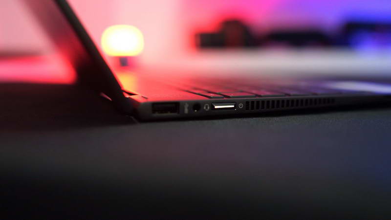 Mengejar fisik yang tipis, laptop ini tidak banyak menyediakan port. Port yang disediakan ada port USB 3.1 Gen 1, port audio combo untuk headphone dan microphone, dan slot micrsoSD card reader di sisi kiri. Sedangkan di sisi kanan tersedia satu port USB 3.1 Gen 1 dan USB Type-C yang mendukung koneksi Display Port 1.4 dan HDMI 2.0b dengan adapter tambahan yang disediakan. Dengan adanya adapter ini, akan menjadi poin plus bagi karyawan atau mahasiswa yang sering melakukan presentasi. Pada bagian I/O port juga terdapat tombol power di sisi kiri dan tombol volume bagian kanan.