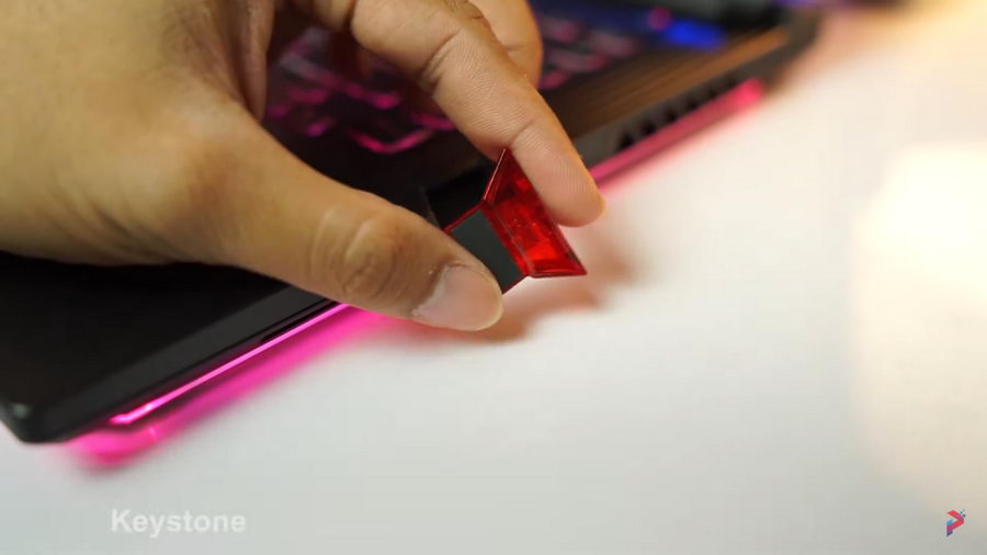 Keystone ini berupa dongle yang terpasang di sisi kanan. Bentuknya mirip flashdisk tapi portnya bukan USB. Gunanya buat menyimpan profil atau pengaturan yang sudah kalian buat di Armoury Crate. Jadi kalau kalian instal ulang laptop, tidak perlu lagi utak-atik Armoury Crate-nya. Tinggal jalankan profil yang sebelumnya udah disimpan. Praktis kan. Oiya, kalian juga bisa kunci folder rahasia pribadi kalian dengan Keystone ini. Keystone ini bisa kalian lepas kayak flashdisk. Dan biar tidak gampang hilang, paket penjualan udah menyertakan tempat nyimpan Keystone yang punya bentuk kayak gantungan kunci.