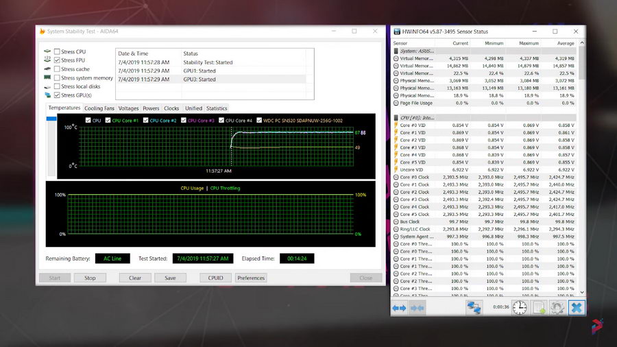 Sistem pendingin yang dipakai laptop ini ternyata memang cukup ampuh. Airhole di bagian bawah yang cukup besar akan menyedot udara. Lalu suhu panas dibuang lewat airhole yang ada di sisi belakang dan samping kanan. Ini masih ditambah dengan dua fan pada CPU dan GPU serta beberapa heatpipe yang menyambung dengan dua komponen itu. Saat kami melakukan stress test CPU dan GPU pake software AIDA64, suhu berjalan di kisaran 87 derajat celcius. Stress test ini kami lakukan dengan mengaktifkan fitur HyperFan serta mengaktifkan mode Turbo.