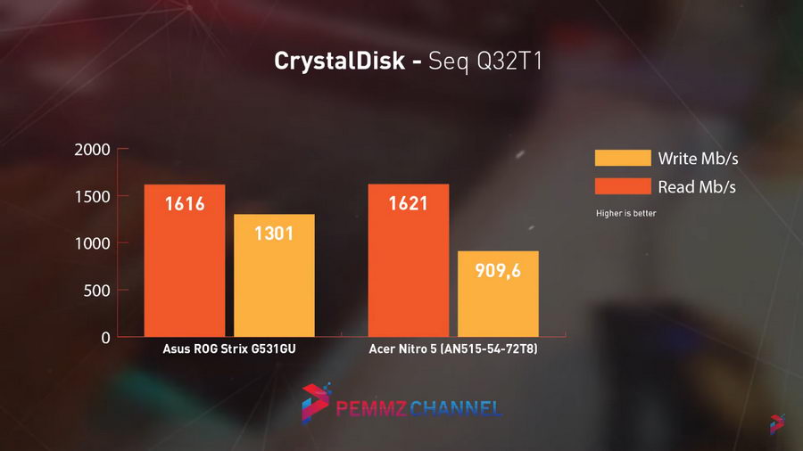 Tapi untuk performanya, secara umum kecepatan baca dan tulis SSD-nya tidak kencang-kencang amat buat sebuah laptop gaming, mesti terbilang sudah cukup untuk skenario gaming. Berikut skor yang didapat SSD sama HDD dari aplikasi benchmark CrystalDiskMark.