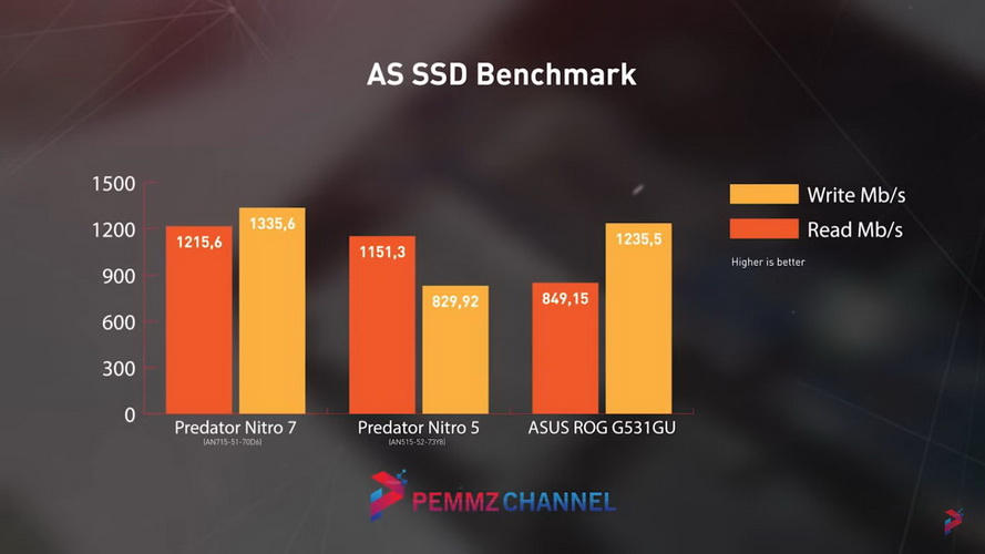 Untuk menekan harga jual dari Nitro 7 ini, storage cuma dikasih satu aja yaitu SSD NVMe. Untungnya kapasitasnya udah lumayan 512 GB M.2 PCIe x4. Lumayan besar kapasitasnya walaupun bukan yang tercepat untuk kecepatan baca dan tulisnya. Untuk performa bacanya sekitar 1215,64 MB/s dan tulisnya 1335,65 MB/s. Sebenernya gak jelek sih, tapi dengan slot M.2 PCIe x4 yang dipake, performa tersebut tidak bisa dibilang bagus-bagus banget. Tapi tentu aja tetap jauh berlipat lipat kali lebih kenceng dibanding HDD SATA. Kalo masih kurang, ada opsi untuk nambah satu SSD lagi dan juga SATA 2,5 inci.
