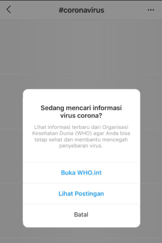 - Instagram berberapa misinformasi terkait virus corona, ketika pengguna ingin mencari tentang info virus tersebut. Pengguna pun akan diarahkan ke akun-akun terpercaya seperti WHO dan CDC.