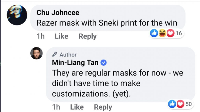 Menurut kabar yang beredar, RAZER sekarang ini akan menyiapkan masker biasa sederhana yang akan diproduksi masal secara terus menerus, namun tidak menutup kemungkinan bahwa Tan akan menggunakan logo ular hijau di maskernya tersebut.