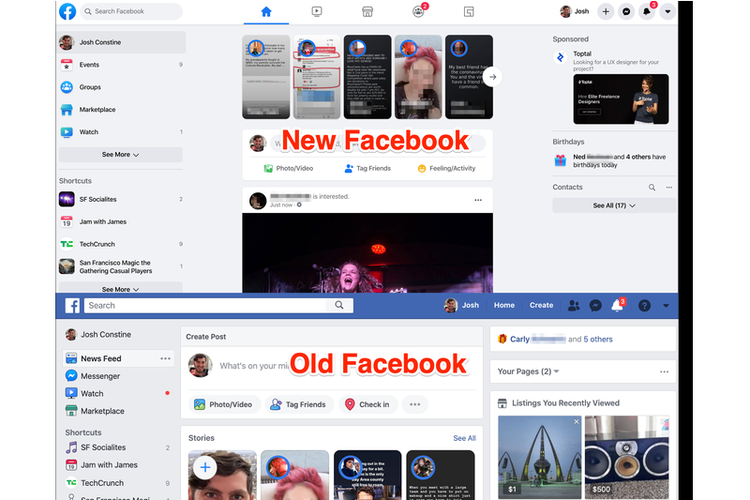 Pada sidebar kiri dan kanan tidak terlalu banyak yang berubah, susunan menu masih terlihat sama. Sidebar kanan masih diisi oleh menu grup, halaman, game, marketplace dan sebagainya. Namun pada sidebar tersebut ada sedikit perbedaan pada sisi kiri yaitu menu tab chat yang tidak berada pada sisi bawah layar. Kini, tab chat sudah berpindah di bawah bagian sponsor.