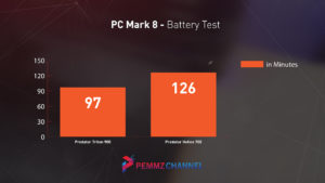 Untuk pengujian baterai, kami menggunakan PCMark 8 Home Conventional dengan mode Power Saving menyala, WiFi dimatikan dan brightness diatur ke paling rendah. Dengan skenario pengujian seperti yang kami sebutkan laptop ini mampu bertahan selama 97 menit, dengan daya tahan seperti itu otomatis membuat laptop ini tidak dapat dibawa bepergian tanpa charger sekalipun dalam waktu yang sebentar, hal ini dikarenakan spesifikasi yang dibawa oleh laptop ini.