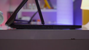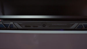 I/O Port yang terdapat pada laptop cukup lengkap. Disebelah kiri terdapat 1x USB 2.0 type-A yang letaknya sangat tersembunyi dengan mendorongnya kedalam untuk mengeluarkannya, combo audio port, 1x USB 3.1 type-A, dan exhaust. Disebelah kanan terdapat Kensington lock, 1x USB 3.1 dengan Thunderbolt 3, 1x USB 3.1 type-A, LAN port, dan exhaust. Dibagian belakang terdapat exhaust port disebelah kiri dan kanan, fullsize DisplayPort, HDMI, dan DC-in port