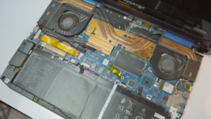 Laptop ini memiliki opsi upgrade yang bisa dibilang agak pelit, karena tadinya kami mengira dengan fisik laptop yang cukup besar, laptop ini memiliki slot HDD 2.5 inch tapi ternyata tidak ada. Hanya ada dua slot SSD M.2 NVMe yang sudah terisi dan terkonfigurasi dengan RAID 0, dan dua slot RAM yang sudah terisi masing-masing dengan RAM berkapasitas 16GB DDR4 2666Mhz.