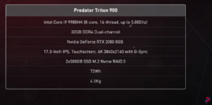 Kata siapa laptop gaming dengan jeroan sangar itu harus tebal untuk mengatasi panas CPU dan GPU yang dihasilkan? Hal tersebut berhasil dipatahkan oleh acer melalui Predator Triton 900. Ya, Predator Triton 900 ini memiliki spesifikasi sangar, sebut saja penggunaan CPU Intel Core i9 9980HK dan GPU Nvidia GeForce RTX2080 MaxP di dalam body dengan ketebalan tidak sampai 3cm. Tidak hanya itu, laptop ini juga memilki 4 mode pengoperasian berbeda-beda yang siap untuk mendukung kegiatan gaming, hingga kegiatan content creation kalian.