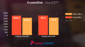 Laptop ini menggunakan konfigurasi dual SSD M.2 NVMe berukuran 500GB oleh WDC dengan tipe SDAPNTW-512G-1014 dan berjalan di konfigurasi RAID 0 secara default. Dikarenakan berjalan pada RAID 0, maka performa kedua SSD ini cukup tinggi dan rasanya upgrade tidak terlalu dibutuhkan pada laptop ini terkecuali bagi kalian yang membutuhkan storage yang besar dan cepat. Untuk hasilnya dapat dilihat pada chart berikut.