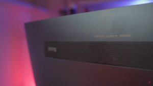Beralih ke bagian belakang, ada grille berlogo BenQ yang didalamnya terdapat subwoofer 5W dengan ditemani tulisan “Superior Sound by treVolo”. Selain itu ada VESA mount, kensington lock, dan 4 tombol yang terdiri dari 2 tombol shortcut, 1 joystick, dan tombol power.