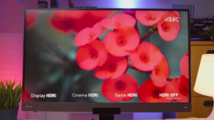 Sementara pada sisi kanan terdapat status LED dan logo HDRi yang menjadi fitur pada monitor ini, sedangkan di bagian tengahnya terdapat sensor brightness dibalik permukaan plastik berwarna hitam. Oh ya pada bezel bawah ini juga terdapat dua speaker berdaya 2W pada bagian kiri dan kanannya.
