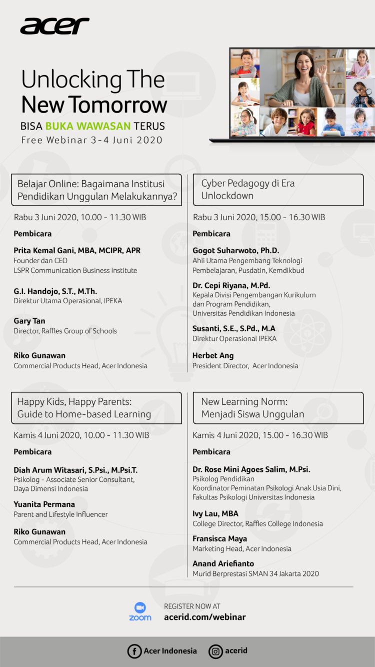 Seri Webinar Buka Wawasan Terus dari Acer Indonesia dapat diikuti secara gratis oleh seluruh masyarakat. Untuk pendaftaran bisa mengunjungi tautan https://acerid.com/webinar