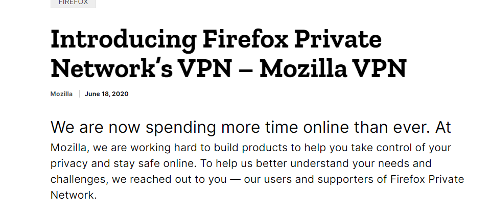 Saat pertama kali diluncurkan dalam versi beta tahun lalu, VPN ini hadir sebagai ekstensi para Mozilla Firefox versi desktop. Pada saat resmi dirilis untuk versi Android, yakni pada Februari 2020. VPN ini telah berganti nama menjadi Mozilla VPN.