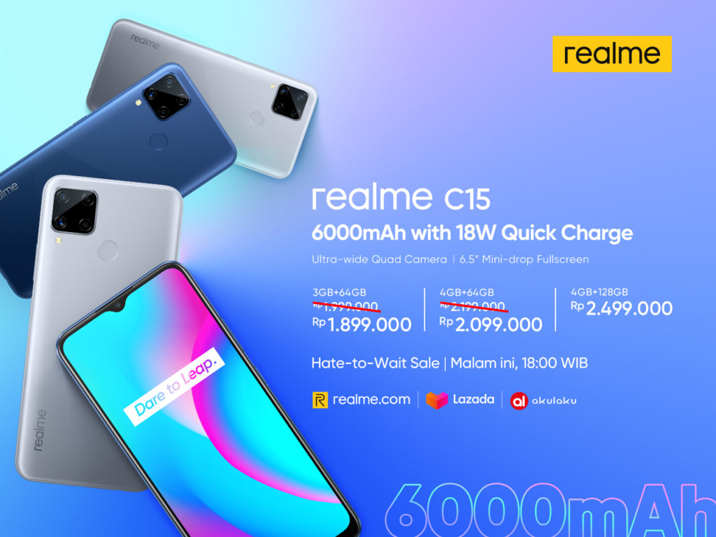 Untuk anak muda yang tidak sabar memiliki Realme C15 “6000mAh with 18W Quick Charge”, Realme HARI INI mengadakan Hate-to-Wait Sale mulai pukul 18:00 WIB di realme.com/id, Lazada, dan Akulaku. Melalui program ini, Realme akan memberikan harga khusus untuk setiap pembelian Realme C15 mulai dari Rp 1.899.000. Untuk pecinta gadget yang ketinggalan program “Hate-to-Wait Sale”, jangan khawatir karena Realme C15 akan kembali melakukan Flash Sale online pada 29 Juli pukul 10:00 WIB di realme.com/id, Lazada dan Akulaku.