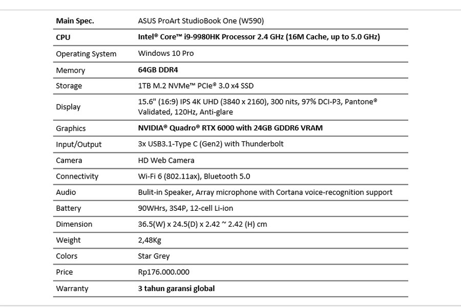Dengan harga setinggi itu, ASUS ProArt StudioBook One (W590) jelas dipersenjatai dengan spesifikasi monster yang diklaim sebagai laptop profesional paling powerful di dunia. ASUS sendiri menyebutkan bahwa performanya dapat disandingkan dengan high-end desktop workstation.