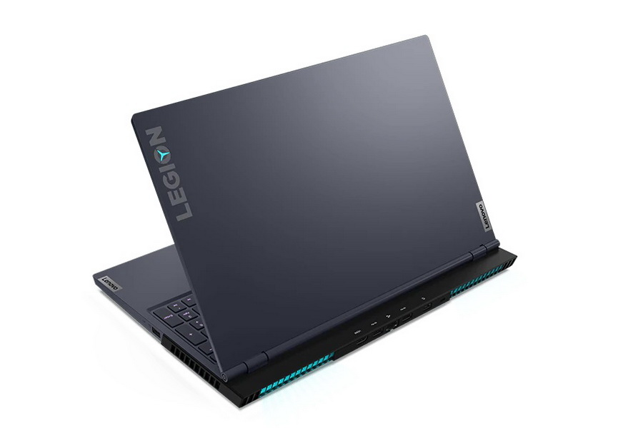 Tampilan belakang laptop gaming Lenovo Legion 5i 15IRX10 di atas meja kerja, menyorot desain premium dan logo Legion.
