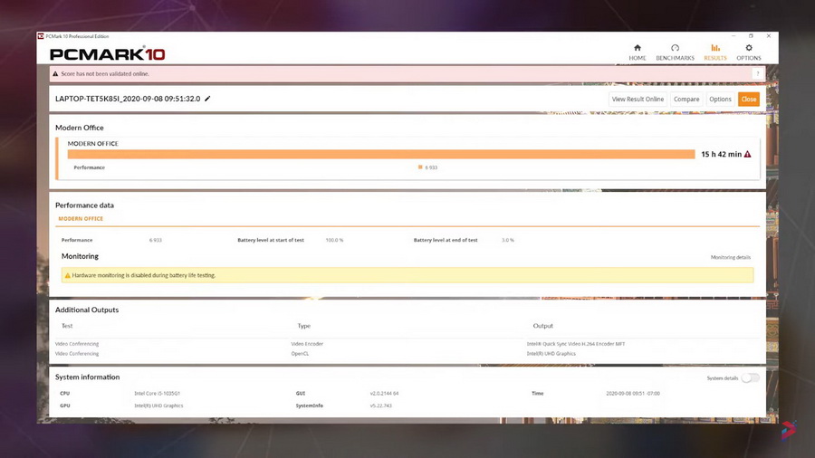 Skenario pengujian yang kami lakukan adalah menggunakan PCMark 10 Modern Office dengan mode Power Saving menyala, WiFi dimatikan dan brightness diatur ke paling rendah. Oiya, untuk adaptornya sendiri menggunakan konektor USB type-C dan bukan DC-in. Konektor ini udah support pengisian cepat. Dengan pengisian sekitar 49 menit, baterai dari kondisi 0%, bisa keiisi sampai 60%. Mantap lah.