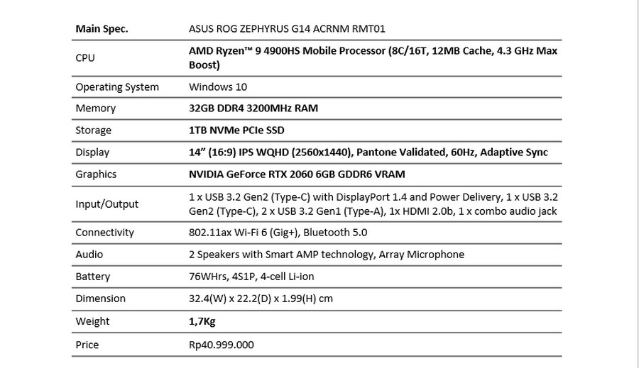 ASUS ROG ZEPHYRUS G14 ACRNM RMT01 akan dijual dengan jumlah yang sangat terbatas pada bulan Oktober 2020 di Indonesia dengan banderol harga Rp40.999.000.