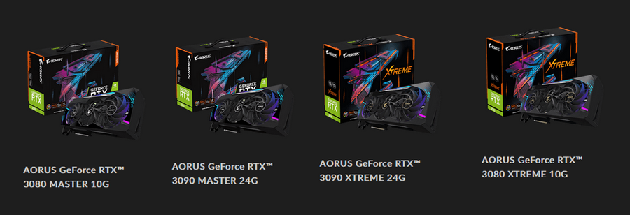 Hadirnya GeForce RTX 30 series membuat GIGABYTE langsung gerak cepat dengan meluncurkan lini produk kartu grafis menggunakan chip tersebut. Ada 4 kartu grafis yang diluncurkan, yaitu AORUS GeForce RTX 3090 XTREME 24G, AORUS GeForce RTX 3090 MASTER 24G, AORUS GeForce RTX 3080 XTREME 10G, dan AORUS GeForce RTX 3080 MASTER 10G.
