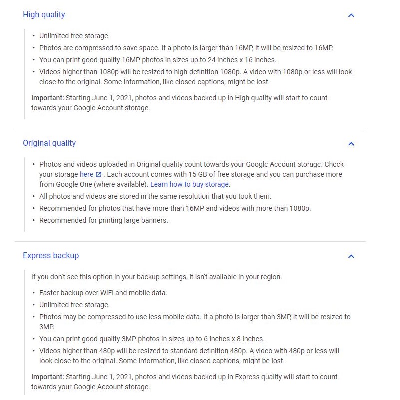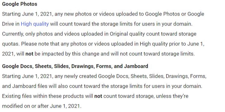 Mulai tanggal 1 Juni 2021, setiap foto atau video baru yang diupload ke Google Foto atau Google Drive dalam high quality akan terhitung kedalam kuota 15GB cloud storage gratis yang disertakan untuk setiap akun Google. Saat ini, hanya foto dan video yang diupload ke Original Quality saja yang terhitung kedalam kuota penyimpanan Google Foto atau Google Drive.