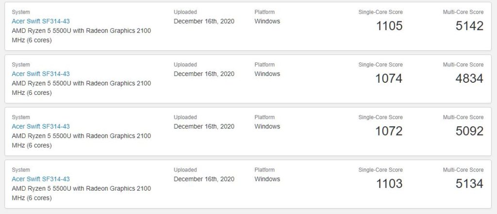 Prosesor Ryzen 5 5500U ini memiliki 6 core, 12 threads, dengan kekuatan antara 2.10 GHz hingga 4.00 GHz, berbeda dengan Ryzen 7 4700 yang memiliki 6 core, 12 threads, dengan kecepatan antara 2 GHz hingga 4.1 GHz. Laptop ini mendapat skor Geekbench serendah-rendahnya 1072 single core, dan 4834 multi core. Geekbench juga memberi tahu bahwa laptop Acer Swift SF314-43 yang belum dirilis ini memiliki 16 GB DDR4 RAM.